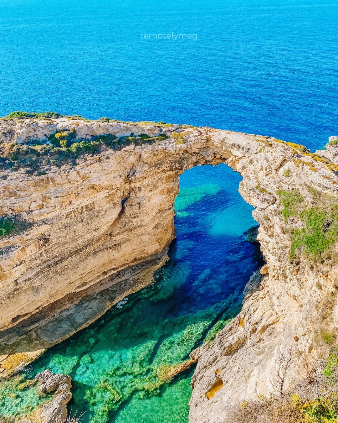 The arch is made of natural limestone that has been carved by the erosive forces of wind and sea over thousands of years. It stands majestically above the turquoise waters, creating a breathtaking image against the backdrop of rugged cliffs and lush greenery.